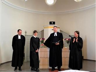 Foto 2, F. Dorn: Pfarrerin Sarah Steuer (2. v. l.) ist am Sonntag in ihren Dienst als Pfarrerin von Superintendent Thomas Köhler (2. v. r.) eingeführt worden. Mit dabei waren Pfarrerin Annett Weinbrenner und Pfarrer Martin Liedtke.