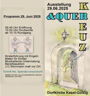 Am Sonntag, den 29. Juni 2025, lädt die Dorfkirche Kasel-Golzig ab 09:45 Uhr zu einer besonderen Kunstausstellung ein. Unter dem Motto „kreuz & quer“ präsentieren Künstler*innen aus dem Ort ihre Werke.