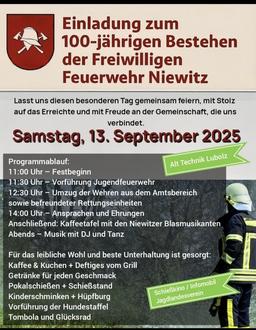 | 12:30 Uhr – | Umzug der Wehren aus dem Amtsbereich sowie befreundeter Rettungseinheiten |