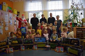 Gleich am nächsten Tag, dem 7. Dezember 2022 hatten wir unsere Weihnachtsfeier in der Kita. Nach einem leckeren, gemeinsamen Frühstück warteten wir ganz gespannt auf den Weihnachtsmann. Er kam nicht mit dem Schlitten und seinen Rentieren, denn es lag leider kein Schnee. Der Weihnachtsmann und seine Gehilfen kamen mit einem großen Teleskoplader. In der Schaufel lagen die vielen Geschenke und er stand persönlich mittendrin. Wow, war das aufregend! Er hatte nicht nur Geschenke für jedes Kind mitgebracht, sondern auch viele Geschenke für den Kindergarten zum spielen. Darunter waren Traktoren mit Hänger, viele Stifte zum malen, ein Pferdetransporter und viele andere tolle Fahrzeuge. Ein „riesengroßes Dankeschön“ gilt dem Verein „Feel the Summer e. V.“, welcher diese riesigen Überraschungen für uns gesponsort hat.