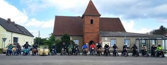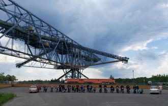 Danach starteten 18 Zweirad-Oldtimer und 2 schön hergerichtete Trabis auf die geplante Strecke nach Lichterfeld. Dort gelang es unseren Fahrzeugen, den F60-Besuchern ein Lächeln ins Gesicht zu zaubern. Nach einer Pause auf dem Gelände der F60-Förderbrücke und schönen Aufnahmen, starteten alle Teilnehmer auf die Rücktour nach Kleinkrausnik. Alle Fahrer hatten ihr Fahrzeuge super gewartet und so kamen wir ohne Pannen und unfallfrei nach Kleinkrausnik, hier erwarteten uns kühle Getränke und leckeres vom Grill. Mit Zündkerzenzielwurf und Bierglasschieben konnten sich unsere Gäste und natürlich auch die Kleinkrausniker die Zeit vertreiben. Das beste am diesem schönen Tag waren aber die Gespräche über unsere Leidenschaft Oldtimer und unsere Schätzchen.
