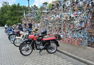Auch dort wurden vor der eigenwillig gestalteten Fassade schöne Fotos geschossen. Um 14:30 Uhr waren wir dann in Doberlug Kirchhain in der Technischen Ausstellung des Weissgerbermuseum. Der Leiter der Einrichtung, Dr. Hanslok, hat uns die dort ausgestellten, noch funktionstüchtigen Maschine erklärt und vorgeführt. Die Teilnehmer war beeindruckt von dieser Technik und alle waren der Meinung, dass dieser Besuch ein schöner Abschluss unserer Ausfahrt war. Zurück in Kleinkrausnik konnten sich die Teilnehmer erstmal stärken und es wurden in gemütlicher Runde so einige Geschichte über dieses schöne Hobby ausgetauscht.