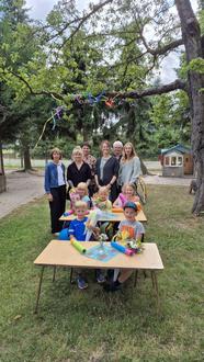 Bei lecker Kaffee und Kuchen und einer Hüpfburg verging der Nachmittag viel zu schnell. Es gab Gespräche über die Kita-Zeit, Erinnerungen wurden ausgetauscht, Wünsche aufgeschrieben und mit Ballons in den Himmel steigen gelassen. Dann kam der Abend auch schon immer näher und mit leckeren Hotdogs, Schnitzel, Klopsen und Salaten konnten sich alle noch einmal stärken, bevor es dann nach Hause und bestimmt glücklichen Gedanken ins Bett ging.