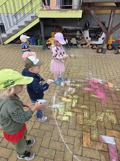 Wir “löschen“ Feuer in verschiedensten Formen - Kreide auf dem Boden und Rasierschaum auf den Tiergehegen aus Duplo Bausteinen.