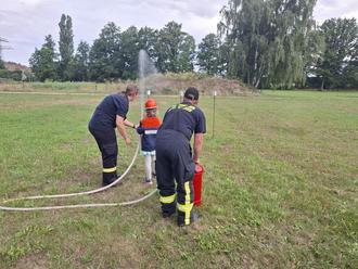 Am tollsten war bis jetzt aber der Besuch der Freiwilligen Feuerwehr Münchhausen. Wir durften einen Helm aufsetzen, die Feuerwehrjacke anziehen und auch selber den Löschschlauch benutzen um Dosen abzuschießen. Das hat so viel Spaß gemacht!!!!