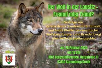 Aufgrund vermehrter Sichtungen von Wölfen durch die Bevölkerung in der Spremberger Innenstadt als auch in den Ortsteilen wurde die Bitte an die Stadtverwaltung Spremberg/Grodk herangetragen, für Aufklärung zu sorgen. Dem kommt sie nach mit einer Informationsveranstaltung am Mittwoch, dem 28. Februar 2024, um 18 Uhr, im Mehrgenerationenzentrum "Bergschlösschen", Bergstraße 11, 03130 Spremberg/Grodk.