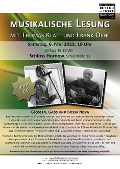 Der frühere Kabarettist Thomas Klatt und Liedermacher Frank Oehl präsentieren Kurzgeschichten aus der Heimatstadt Forst oder dem Innenleben einer „sozialistischen“ Tageszeitung, untermalt mit Bossa Nova.