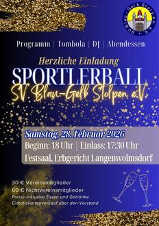 Um diese Wertschätzung gemeinsam zu feiern, laden wir herzlich zu unserem Sportlerball am 28. Februar 2026 im Festsaal des Erbgerichts in Langenwolmsdorf ein. Freut euch auf einen geselligen Abend mit gutem Essen, netten Gesprächen, schöner Musik und Tanz. Eingeladen sind nicht nur unsere Mitglieder und ihre Angehörigen – auch Freunde des Vereins und Nichtvereinsmitglieder sind herzlich willkommen.
