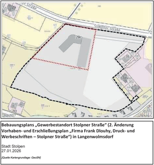 Der Stadtrat der Stadt Stolpen hat in seiner Sitzung am 27.01.2026 die Aufstellung des Bebauungsplans Gewerbestandort Stolpner Straße“ (2. Änderung Vorhaben- und Erschließungsplan „Firma Frank Dlouhy, Druck- und Werbeschriften – Stolpner Straße“) in Langenwolmsdorf mit paralleler Teiländerung des Flächennutzungsplanes der Stadt Stolpen im Bereich dieses Bebauungsplanes beschlossen (Beschluss-Nr. 05/2026).