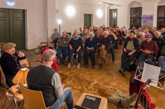 Opitz und Winkler spielten sich die Bälle oder besser Noten zu, mit jeder Menge Geschichten von früher und ganz früher und ebensolcher Musik. Da wurde ein herausragender Blues gespielt und von Übungsstunden in der Gartenlaube erzählt, bei denen die Nachbarn ob der Klänge ein eingesperrtes Schaf vermuteten. Da wurde Vroni Fischers „Auf der Wiese“ so abgewandelt, dass das Gras nicht gekaut, sondern geraucht wurde. Und von versteckten Schnapsflaschen in der Trommel berichtet, die teilweise die Bezahlung ersetzten. Das Publikum wärmte sich an dem Vorgetragenen, als ob es damit den langen Winter vertreiben könnte. Und freute sich auf den Frühling, ganz so,