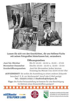 Die positive Resonanz auf die Hellmut-Fuchs-Fotoausstellung ist nach wie vor ungebrochen! Darüber freuen wir uns sehr! Nun haben wir auch Sonderöffnungszeiten eingerichtet: Noch bis November 2023 ist die Ausstellung auch jeden letzten Sonntag im Monat von 13.00 bis 17.00 Uhr geöffnet. Der nächste Sonntagstermin wäre also der 30. Juli 2023. Wenn Sie einen anderen Besichtigungstermin außerhalb unserer Öffnungszeiten wünschen, dann sprechen Sie uns bitte an oder schreiben uns eine E-Mail. Wir versuchen alles möglich zu machen!