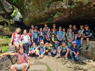 Am 4. Juli 2023 fuhren wir, die 4. Klasse mit Frau Hamisch unserer Klassenlehrerin, Frau Rodig, Frau Großmann, Frau Schaffrath, Herrn Schaffrath, Frau Wehner und Herrn Knauthe zum Kuhstall. Mit dem Bus ging es los, Herr Schaffrath – Leonies Papa fuhr uns mit einer Sonderfahrt bis zum Betrieb in Bad Schandau, wo er als Busfahrer arbeitet. Dort haben wir sogar einen Bus von unten gesehen. Er hat uns auch die verschiedenen Kirnitzschtalbahnen gezeigt. Die älteste ist 1925 gebaut worden. Dann sind wir mit einer Bahn zum Lichtenhainer Wasserfall gefahren. Dort haben wir uns erstmal gestärkt. Nun liefen wir auf den Kuhstall, wo wir eine tolle Aussicht auf Berge und Wälder hatten. Als wir wieder runter liefen, konnten wir noch einmal mehrere Steinfiguren bestaunen. Ein paar Kinder bauten auch noch welche dazu.