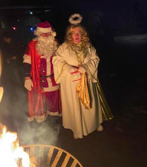 Besonders aufgeregt waren die Kinder beim Weihnachtsleuchten. Auf der Einladung stand nämlich, dass wir Besuch vom Nordpol erwarten. Und tatsächlich, eine Feuerfontäne an der Straße zeigte an, dass der Weihnachtsmann, begleitet von einem seiner Weihnachtsengel mit seinem Schlitten angekommen war. Der Engel half dem Weihnachtsmann tatkräftig, denn es gab einiges zu tun. Im großen Sack, den der Weihnachtsmann über der Schulter trug, steckte ein wunderschöner roter Briefkasten für die Weihnachtswünsche, der gleich bei Paule angebracht wurde. Die Kinder können nun ihre Wunschzettel in den Briefkasten stecken, der in drei Wochen von den Wichteln des Weihnachtsmanns geleert wird. Natürlich brachte er auch Süßigkeiten für die kleinen und großen Kinder mit, aber dafür mussten zuerst alle ein Lied singen. Der Engel wusste, dass die Wußwerkerinnen und Wußwerker gern singen und so erklang Kling Glöckchen klingelingeling am Dorfteich. Leider musste der Weihnachtsmann mit seinem Engel dann aber wieder zum Nordpol aufbrechen, nicht ohne vorher noch Schneestaub zu verteilen. Die Feuerfontäne zeigte, dass der Schlitten gestartet wurde und nun heißt es bis zum 24. Dezember warten.
