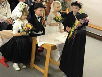 Nach einer kurzen Pause war es endlich soweit und der Hochzeitsmarsch erklang. Ein deutsches und ein sorbisches Brautpaar betraten feierlich, zusammen mit ihrer Hochzeitsgesellschaft, den Raum. Ein Staunen ging durch die Zuschauermenge, beide Brautpaare waren wunderschön anzusehen und verzauberten voller Stolz sämtliche Zuschauer. Mit den einzelnen Strophen des bekannten Volkslieds „Die Vogelhochzeit“ begannen die szenischen Darbietungen der verschiedenen Vögel. Alle Vögel brachten sich ein, es kam der Auerhahn als Hochzeitsbitter, die Enten, die Meise, der Sperling und natürlich – ganz spreewaldtypisch – der Storch. Anschließend ging es mit dem Nestbau weiter und beide Vogelpaare wurden nach langem Brüten Eltern. Die beiden frisch geschlüpften Vogelküken begrüßten freudig ihre Eltern und machten schon bald die ersten Flugversuche. Zum Ende der Vogelhochzeit tanzten alle vergnügt im Raum und feierten diesen besonderen Tag. Nach solch einer Aufregung lud im Anschluss der Hochzeitsbitter zum Festschmaus an die festlich gedeckte Tafel ein. Dieser Einladung folgten alle gerne und ließen sich Hochzeitstorte, Vogelkekse und leckeren Saft schmecken.