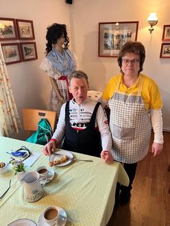 So hat Karsten Opitz (71) aus Lübben die Gelegenheit genutzt, um bei seiner Radtour den Plinsebäckerinnen einen Besuch abzustatten. Hier hat ihm Inge Ziemainz die süße Stärkung gebracht, die er sich gern schmecken ließ. Der rüstige Rentner fährt mit seinem Rad mehrmals in der Woche durch die Region. An dem Dienstag hatte er mit einem Freund bereits ca. 50 km zurückgelegt. Deshalb braucht er sich um seine Figur keine Sorgen machen und kann einen Plins mehr verspeisen.