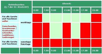 Nach der 32. Verordnung zur Durchführung des Bundes-Immissionsschutzgesetzes dürfen Geräte und Maschinen in Wohngebieten an Sonn- und Feiertagen sowie an Werktagen zwischen 20.00 Uhr und 7.00 Uhr in Wohngebieten nicht betrieben werden. Für folgende Geräte gibt es eine Sonderregelung: Freischneider, Grastrimmer, Graskantenschneider mit Verbrennungsmotor, Laubbläser und Laubsammler mit Elektro- oder Verbrennungsmotor sowie Geräte ohne Umweltkennzeichen dürfen in Wohngebieten auch in der Zeit von 7.00 Uhr bis 9.00 Uhr, von 13.00 Uhr bis 15.00 Uhr und von 17.00 bis 20.00 Uhr nicht betrieben werden.