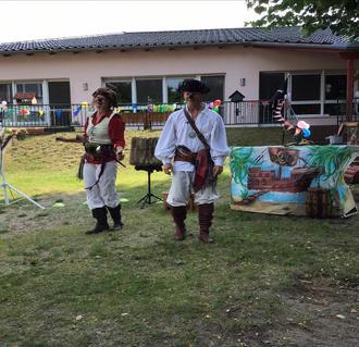 Am 05.06.2025 begrüßten wir in unseren Kindereinrichtungen die Künstler Cindy & Ingsen van Knusden von der ABC- Show. Als „Blake Nose“ Piraten entführten sie unsere Kinder in ein buntes Unterhaltungsprogramm voller spannender Abenteuer auf hoher See. Die Kinder verwandelten sich in junge Piraten und konnten zusammen mit Piratin „Susi“ und Kapitän „Willi“ das echte Piratenleben auf dem Deck eines Piratenschiffs erleben. Gemeinsam wurden Piratenlieder gesungen, die Segel gehisst und Seeungeheuer vertrieben. Am Ende fanden wir sogar einen Goldschatz und segelten anschließend wieder sicher in den Heimathafen. Mit Musik, lustigen Sprüchen und kleinen Zauberstücken erlebten die Kinder einen besonderen Tag mit viel Freude, Tanz und einem echten Abenteuer.