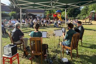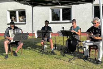 Umso glücklicher waren die vier Musiker für die gelungene Premiere. Johanna Weihrauch wuchs in Lübben auf und zog später nach Alt Zauche. Inzwischen lebt sie mit ihrem Partner Florian Wild hier und in Berlin. Johanna unterrichtet an verschiedenen Musikschulen (z.B. in Luckau) die Fächer Klarinette, Saxophon und Blockflöte. Florian ist gelernter Holzblasinstrumentenmacher und war beim Konzert ebenfalls an verschiedenen Blasinstrumenten zu hören. Daniel Weinland entlockte dem Akkordeon die schönsten Melodien und Joachim Zecher ergänzte mit Gitarre, Mandoline und Ukulele. Übrigens der Name Levante kommt u.a. von der Bezeichnung eines Ostwindes in Spanien, was für die Gründer des Quartetts sehr gut zur Musik passt. Auch als der Beifall nach dem Konzert verklungen war, verweilten die Gäste noch lange, um die schöne Stimmung dieses milden Sommerabends noch zu genießen, zu plaudern und weil sie hoffen, dass es nicht der letzte Auftritt bleibt.