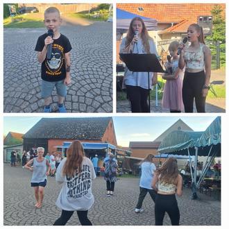 Für die musikalische Unterhaltung sorgte Ewald mit Liedern verschiedenster Genres. Eine bunt gemischte Liedauswahl für Alt und Jung lockte die Festbesucher recht schnell auf die Tanzfläche. In Abständen brachten die dargebotenen Einlagen vom Gesangstrio, Abwechslung in das Nachmittagsprogramm und so manche Melodie weckte bei den Gästen sicher auch Erinnerungen. Ein besonderer Höhepunkt war der Auftritt der „Schlagerkids“. Unsere drei jungen Sängerinnen Sophia Altkuckatz, Sofia Korn und Leonie Grundmann, heizten mit ihren Liedern wie „Wir sind die Schlagerkids“ oder „Unsre Oma fährt im Hühnerstall Motorrad“ das Publikum richtig ein. Dabei radelte auch die Oma über den Festplatz und sorgte für eine ausgelassene Stimmung. Etwas später war der spontane Auftritt von Mico Weinert der Oberknaller. Mit seinem Vortrag von Udo Lindenberg „Komet“ und einer Tanzeinlage nach der Melodie „Moskau“ von Dschingis Khan war die Stimmung auf dem Höhepunkt und das Publikum tobte. Die Kids wurden vom Publikum mit anhaltendem Beifall belohnt und für ihren Mut bewundert.