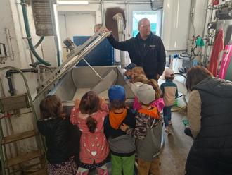 Weiter ging es in die Futterhalle, wo die Kinder das Futter der Kühe berührten und rochen. Herr Bulligk zeigte uns die Melkanlage, und alle durften frische Milch probieren – einige sogar mit Kakao verfeinert. Den Abschluss bildete die Erkundung der Weide, auf der die Kühe grasten, sowie eine interessante Präsentation der Landmaschinen, die auf dem Hof genutzt werden.