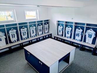 Nachdem wir Anfang des Jahres erfolgreich über eine Crowdfunding-Aktion die Finanzierung gesichert haben ist nun das Projekt abgeschlossen: Unsere neue Blau-Weiß Heimkabine ist fertig! Nach langer Planung haben wir die Sommerpause genutzt und fleißig gehandwerkelt. Wir haben die beiden kleinen Heimkabinen durch einen Wanddurchbruch miteinander verbunden, die Wände neu verputzt und gemalert sowie die Decke inkl. Beleuchtung und Deckenheizkörper erneuert. Der Fußboden wurde ebenso durch die Firma Fußbodenverlegung Matthias Müller erneuert und als Highlight gestaltete die Möbelwerkstatt Neu Zauche unsere neuen Umkleideschränke.