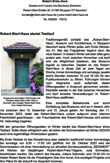 Traditionsgemäß schließt das „Robert-Sterl-Haus“, Museum und Künstlerhaus, in Struppen/ Naundorf seine Pforten jedes Jahr Ende Oktober. Am 01. Mai des Folgejahres beginnt dann die neue Saison. In diesem Winter soll aber alles ganz anders sein. Auch zwischen November und April wird die Möglichkeit bestehen, das Museum regulär zu besuchen. Geplant ist, das Robert-Sterl-Haus in dieser Zeit an zwei Tagen pro Woche, immer donnerstags und samstags, jeweils sechs Stunden zwischen 10 und 16 Uhr für den Publikumsverkehr zu öffnen. Führungen können nach Absprache auch außerhalb dieser Öffnungszeiten in Anspruch genommen werden. Ebenfalls werden in der Zeit zwischen November und April einzelne Veranstaltungen im Robert-Sterl-Haus stattfinden.