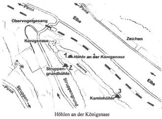 „Wer von der Steinbank oben ein wenig schräg ab über einen kleinen Steg und einige Blöcke hinab nach Norden vorklettert, gewahrt hinter einem Felskopf eine etwa 12 qm starke Vermauerung einer Kluftsohle. Und wer sich oben von der Steinbank und der Elbaussicht weg nach Süden wendet, der sieht 25 Schritte vor sich am Rande der Fichtenschonung ein etwa 6 qm großes, ½ m tiefes, seitlich ½ m hoch aufgemauertes Geviert, im Süden durchbrochen von einem zu etwa 2/3 vom Boden her verschütteten Eingang eines rohschichtigen, sturzverdämmten Mauerwerkes. 2 m dahinter kann man sich durch eine Einsturzöffnung von oben her etwa 2 m tief und 4 ½ m weit hinabzwängen. Dann gebietet eine quer vorgestürzte Wand leider rasch Halt. Folgt man dagegen von der Steinbank weg dem hart am Elbtalrande hinführenden Wege, so trifft man etwa nach 60 Schritten zur rechten Hand, etwas innerhalb der Schonung auf nordsüdlich laufende Senkmulden und in diesen auf zwei etwa 15 Schritt von einander entfernte Einstiegslöcher zu einem durchaus rohwandigen und unebenen Gesteinsstollen. Diesen Stollen kann man durch die erste, nach Westen offene, nur ¾ m hohe Öffnung 7 ½ m weit in knapp 1 ½ m Höhe und Breite begehen, während die südlichen, nach Osten offene, nur ebenso große, ca. 2 m tiefe Einsturzstelle in einen Gang führt, der sich nach 6 ½ m in einen oberen, noch 3 m weiter reichenden und einen etwas tieferen, noch 5 ½ m langen Zweitstollen teilt. Diese beiden, vielleicht nur durch späteren Einsturz getrennte Gänge sind bis zu 2 ½ m hoch und liegen 4 – 5 ½ m unter der Hochfläche der Königsnase. Sie führen heute zwar rechts des Weges, aber doch bis dicht an die Außenwände heran, lagen früher indessen um etwa Steinbruchbreite weiter rand-innen. Denn der Felsblock der Königsnase, ehemals nach beiden Tälern hin weiter vortretend, hat durch den Steinbruchbetrieb (Mitte 19. Jahrhundert bis Anfang 20. Jahrhundert) eine bedeutende Flankenschmälerung erlitten. Fest versackte Gesteinsmassen verwehren ein weiteres Vordringen in die Tiefe der Stollen. Doch ist die Erdoberfläche oben von Sturzmulden, -trichtern und -gräben über eine Fläche von etwa 300 qm derart auffällig durchzogen, dass der Umfang des unterirdischen Gangwerkes sich danach ungefähr abschätzen lässt.“