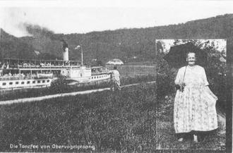 Die Tanzfee Frau Minna verw. Lichtenberger geb. Haubold, Obervogelgesang Nr. 15 a begrüßte seit Jahren mit einem roten Sonnenschirm die Schiffe. Kommt aber das Konzertschiff, so riskierte die alte Dame ein regelrechtes Tänzchen. – Aufnahme von 1932 –