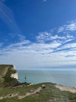 Der Mittwoch hielt für uns eine Fahrt an Englands Südküste bereit. Früh am Morgen fuhren wir nach Eastbourne und wanderten entlang der beeindruckenden Kreidefelsen vorbei an Leuchttürmen und allerlei Schafen bis zum 162 m über dem Meer gelegenen Punkt namens „Beachy Head” (abgeleitet vom französischen Beauchef - schönes Kap). Hier bot sich uns ein atemberaubender Blick über den Atlantik und den Nationalpark der Seven Downs.