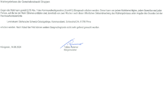Der Gemeindewahlausschuss hat in seiner öffentlichen Sitzung am 13.06.2024 das Wahlergebnis in der Gemeinde Struppen ermittelt.