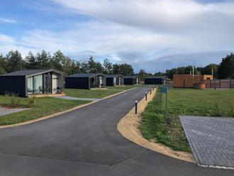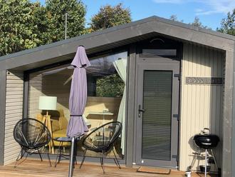 Die Tiny Häuser am Bärwalder See mit Saunatrackt und Becken (rechts) für 12 Personen