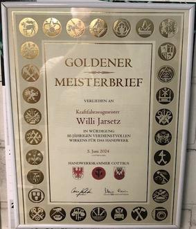 Einen herzlichen Glückwunsch möchte ich deshalb dem nicht nur als aktives und verdienstvolles Mitglied unseres Schützenvereines bekannten Senior-Chef vom Autohaus 1a, Willi Jarsetz, aussprechen, dem zu seinem 50-jährigen Jubiläum die besondere Ehre eines „Goldenen Meisterbriefes“ zu Teil wurde.