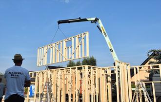 Eine ganze Menge hat sich seit dem offiziellen Spatenstich Anfang Juni auf der Baustelle des zukünftigen Feuerwehrgerätehauses getan. Das Erarbeiten zur Vorbereitung der Fundamente ist erfolgt und die Stahlbetonarbeiten an der Bodenplatte sind erledigt. Mittlerweile ist die Bodenplatte fertig gegossen, so dass in den letzten Tagen der Aufbau der Holzständerwände erfolgte. Dadurch sind inzwischen deutlich die Abmaße des Feuerwehrhauses erkennbar – und mit etwas Fantasie kann man sich bereits die Fahrzeuge in der Halle vorstellen. Der Ersatzneubau des Feuerwehrhauses kommt gut voran und liegt im Zeitplan. Über den weiteren Baufortschritt halten wir Sie auf unserer Webseite oder im nächsten Amtsblatt auf dem Laufenden.