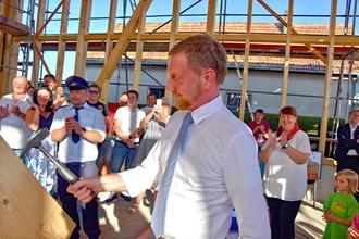 allen Grund zum Feiern gab es am 06. August bei der Feuerwehr Halbendorf. Der Bau des neuen Gerätehauses schreitet planmäßig voran. Rund 64 Tage nach dem offiziellen Spatenstich wurde das Richtfest für den Ersatzneubau des Feuerwehrgerätehauses zelebriert. So konnte nun mit etwa 80 Gästen wie mit unserem Ministerpräsident Michael Kretschmer, unseren ausscheidenden und neu gewählten Gemeinderäten, Bürgermeisterkollege Jörg Funda der Gemeinde Schleife, stellvertretender Kreisbrandmeister Gerd Preußing, Mitarbeiter unserer Verwaltung, Mitglieder des Ortschaftsrates, allen Feuerwehrkameraden unserer Gemeinde und Mitglieder der Alters- und Ehrenabteilung und natürlich der Jugendfeuerwehr, sowie eine Delegation fast aller Feuerwehren der VG Schleife gefeiert werden. Des