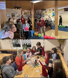 Bild oben: Alle Bahnen belagert. Bild unten: Die Minis mit ihrer Trainerin beim Geschenkeauspacken.