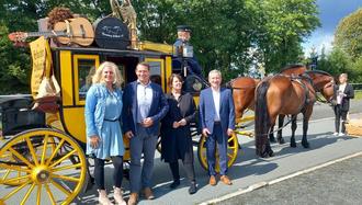 Die historische Postkutsche des Pferdedorfes Erlbach e. V. machte auf ihrem Weg zum Tag der Sachsen in Aue-Bad Schlema eine erste Rast in Schöneck. Begrüßt wurde die Kutsche u. a. von Bürgermeister Andy Anders sowie großen und kleinen Schaulustigen. Ganz spontan wurde passend beim Empfang dazu das Lied „Hoch auf dem gelben Wagen“ angestimmt. Bei einem kleinen Imbiss konnten sich alle stärken, bevor die Reise weiter ging.