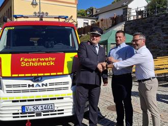 Erster Höhepunkt des Tages – die Übergabe des neuen Feuerwehr-Mehrzweckfahrzeuges. Bürgermeister Andy Anders übergab es gemeinsam mit Landtagsabgeordneten Sören Voigt an Stadtwehrleiter Marcel Richter.