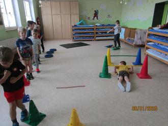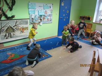 Bei einer Schneeballschlacht mit Wattebäuschen, dem Zielwerfen mit selbst geknüllten Papierschneebällen, einer Schlittenwettfahrt auf den Rollbrettern und Pusteball mit Watteschneeflocken hatten die Kinder trotz Regen und Schneemangel ihren Spaß!
