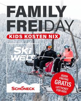 Jeden Freitag fahren Kinder bis 13 Jahre in Begleitung eines vollzahlenden Erwachsenen kostenlos Ski. Das Angebot gilt sogar für das Nachtskifahren und macht den Freitag zum perfekten Start ins gemeinsame Familienwochenende.