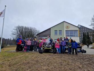 Bei einem Besuch der Bergwachtstation zeigte der Leiter der Bergwacht, Jörg Neidhardt, den Kindern die verschiedenen Räumlichkeiten und erklärte sämtliches Equipment, das zur ersten Hilfe und zur Bergung der Patienten genutzt wird. Da eine Motorschlittenfahrt aufgrund des Schneemangels nicht möglich war, drehte Herr Popp mit den Kindern eine Quad-Runde, was große Begeisterung hervorrief. Zum Abschluss wurden die Mädchen und Jungs mit Wiener im Brötchen und Tee versorgt.