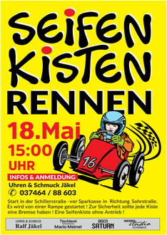 Wie auch schon die letzten Jahre zum Frühlingsmarkt, soll auch dieses Jahr wieder unser Seifenkistenrennen stattfinden. Starten kann jeder mit einer lenkbaren Seifenkiste. Natürlich sollte diese eine Bremse besitzen.