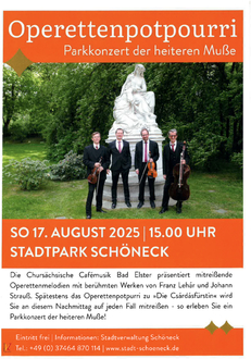 Die Chursächsische Cafémusik Bad Elster gastiert am Sonntag, den 17. August 2025 um 15.00 Uhr mit einem heiteren Operettenpotpurri im Stadtpark Schöneck. An diesem Nachmittag erleben Sie mit leidenschaftlichen Operettenmelodien ein sommerliches Parkkonzert der heiteren Muße: So können Sie u.a. mit Emmerich Kálmáns Operettenpotpourri zu „Die Csárdásfürstin“, dem „Estudiantina“ Walzer von Emil Waldteufel und Frederick Hippmanns „Pusztafest“ sommer-heißblütige Kompositionen erleben.