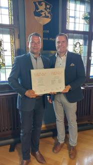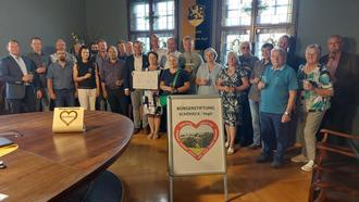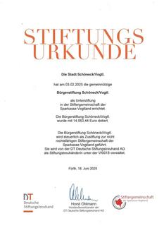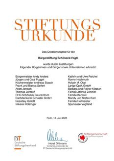 Im Beisein der Gründungsstifter, des Stiftungsrates und Stadträten übergab am 23.6.2025 Kai Lederer von der Sparkasse Vogtland an Bürgermeister Andy Anders die unterzeichnete Stiftungsurkunde für die Bürgerstiftung Schöneck/Vogtl.