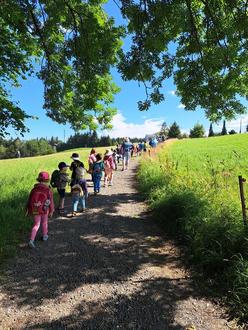 Bei sonnigem Wetter starteten wir die Wanderung bis zu unserem ersten Halt: dem Wasserspielplatz am kleinen Lift. Dort konnten die Kinder sich stärken und spielen. Danach ging es weiter Richtung IFA. Unterhalb des Bauernhofs genossen wir die Aussicht und die Kinder erkannten das Rathaus, die Kirche und die Schulen. Anschließend wanderten wir am IFA, dem Sportplatz und der Jugendherberge vorbei in den Stadtpark. Dort konnten sich die Kinder an den Sportgeräten ausprobieren und danach ging es ausgepowert und hungrig zum Mittagessen in den Kindergarten.