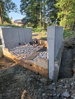 Der Ersatzneubau der Brücke in Zaulsdorf nimmt langsam Gestalt an. Die Stützmauern der Brücke stehen und die Sohle wird wiederhergestellt. In den nächsten Zügen wird die Brücke weiter vervollständigt.