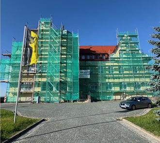 Die Fassadenarbeiten am Rathaus haben begonnen. Das Rathaus wurde bereits komplett eingerüstet und die Malerfirma hat mit den Abklebearbeiten begonnen. Es folgt die Reinigung der Fassade, bevor diese renoviert wird.