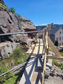 Ende Juli fand die Bauanlaufberatung mit der ausführenden Fachfirma statt, welche dann am 04.08. mit den Sicherungsarbeiten der Abbruchstelle begonnen hat. Im nächsten Schritt wird die Abbruchstelle untermauert, bevor diese wieder in einem natürlichen Erscheinungsbild saniert wird. Ende September sollen die Arbeiten abgeschlossen sein.