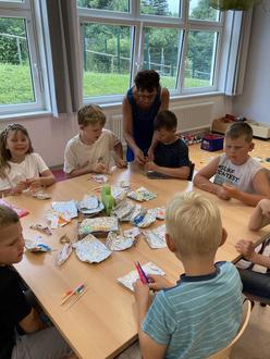 Neben Touren in Schöneck, wie z.B. zum Ritterspielplatz, auf den Pumptrack und zu „Eckis Entdeckerwelt“, wurden auch die wöchentlichen Kreativangebote gerne genutzt. Tolle „Blumenretter“, „Sonnenfänger“, Strandhäuschen aus Papiertüten und bunte Gipsfiguren sind dabei entstanden. Frau Ritter war außerdem wieder bei uns und hat mit den Kindern schicke Armbänder kreiert. Ein großer Dank geht an dieser Stelle an sie, denn die Kinder sind jedes Mal sehr begeistert, wenn sie da ist. Kreativ wurden die Ferienhortkinder auch beim Einstudieren diverser Tänze, die ihnen tosenden Applaus vom Publikum einbrachten.
