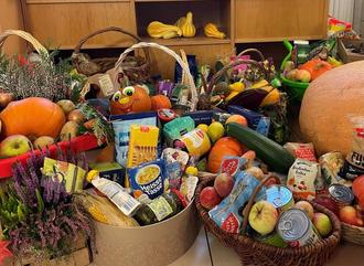 Dank unserer Familien entstand ein reichhaltiger Gabentisch aus liebevoll geschmückten Körbchen mit haltbaren und geernteten Lebensmitteln, die die Kinder die ganze Woche bestaunen konnten.