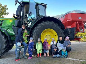 Aber auch rund um die Themen Ernte und Herbst gab es in dieser Woche viel zu erleben. So konnten die Kinder am ersten Tag einen Traktor direkt vor dem Kindergarten erkunden und im Fahrerhaus Platz nehmen. Vor allem für die Kleinsten unserer Einrichtung war es ein Erlebnis, auf dieses riesige Gefährt zu klettern und Höhenluft zu schnuppern.